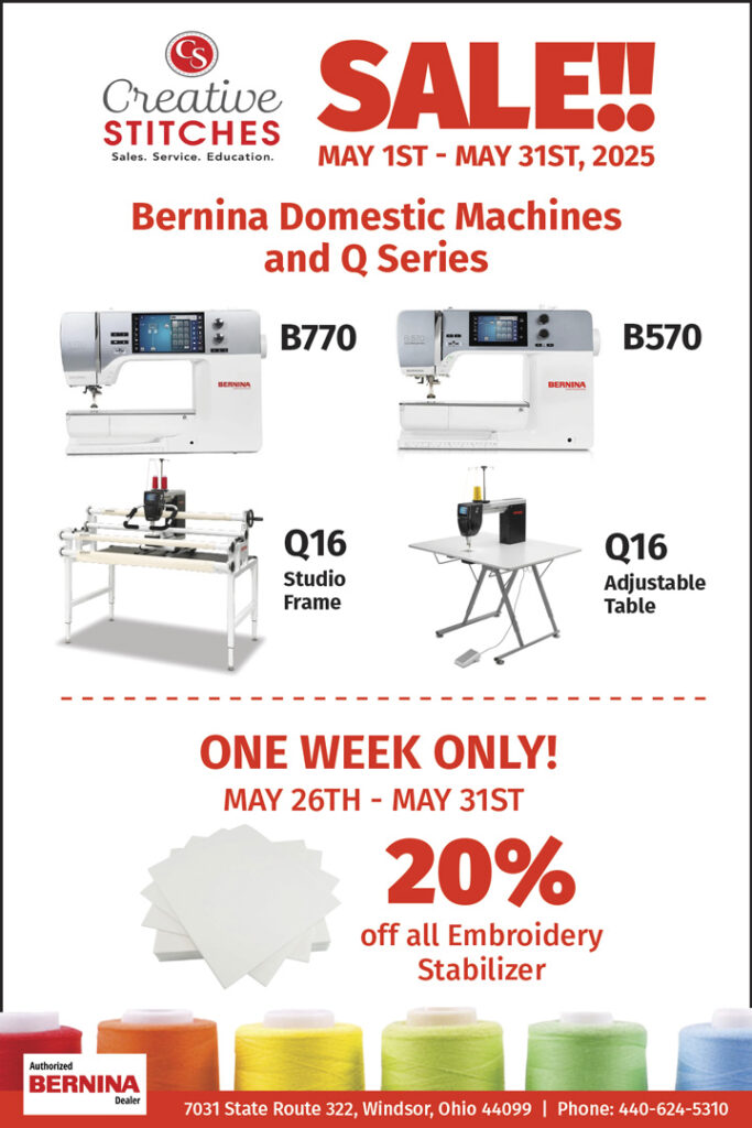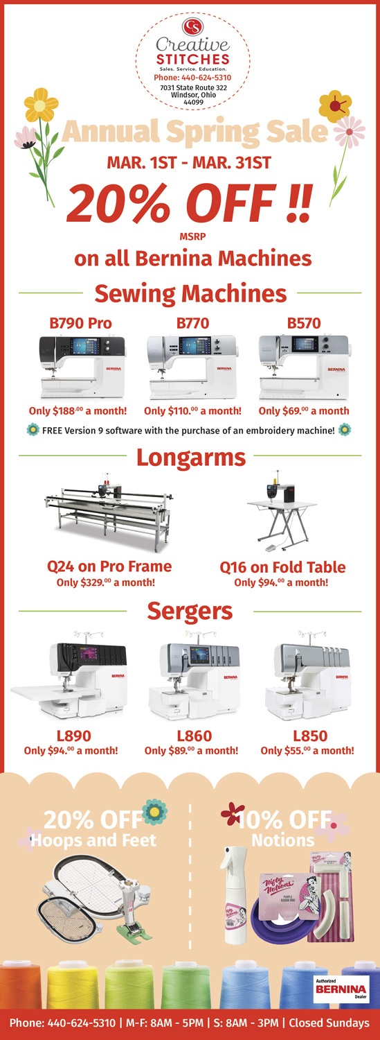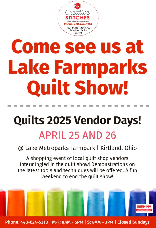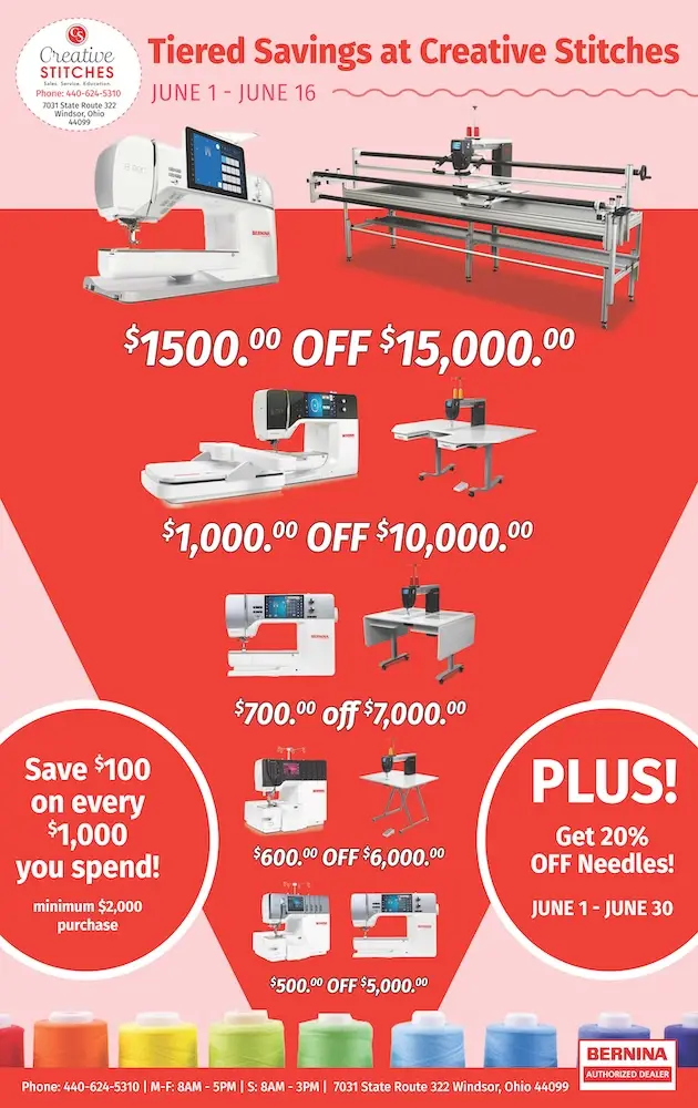 We are a family owned and operated, full service sewing machine distributor located in Windsor, Ohio. We are an authorized dealer for BERNINA sewing machines, a top of the line, best in class machine, and our showroom is available for customers to experience, and test drive the full line of BERNINA machines. We also perform machine repairs in house, so you can get back to doing what you love, faster.