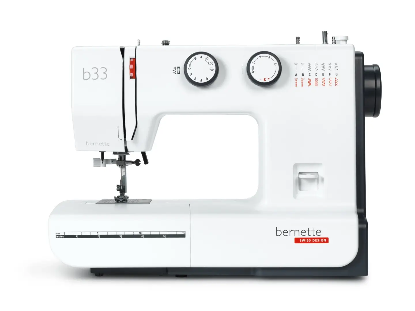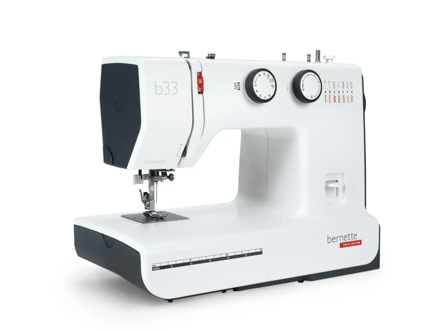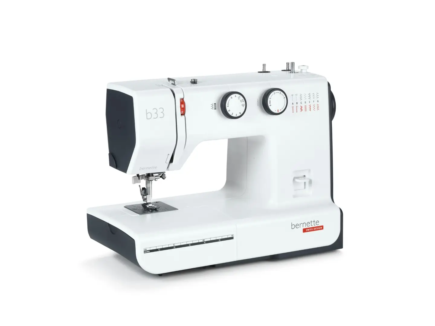 The bernette 33 mechanical sewing machine in stylish Swiss design is the perfect model for beginners. Its simple operation makes it easier to learn the basics of sewing. This machine is durable and robust with excellent stitch quality and all the functions a beginner will need. All the settings can be adjusted by turning the two knobs. The bernette 33 offers 15 stitches, including buttonholes, and has a maximum stitch width of 5 mm. The 2-step presser foot lift, the needle threader and the manual thread cutter make it easy to thread the machine and get started. 5 different snap-on presser feet are included with the bernette 33.