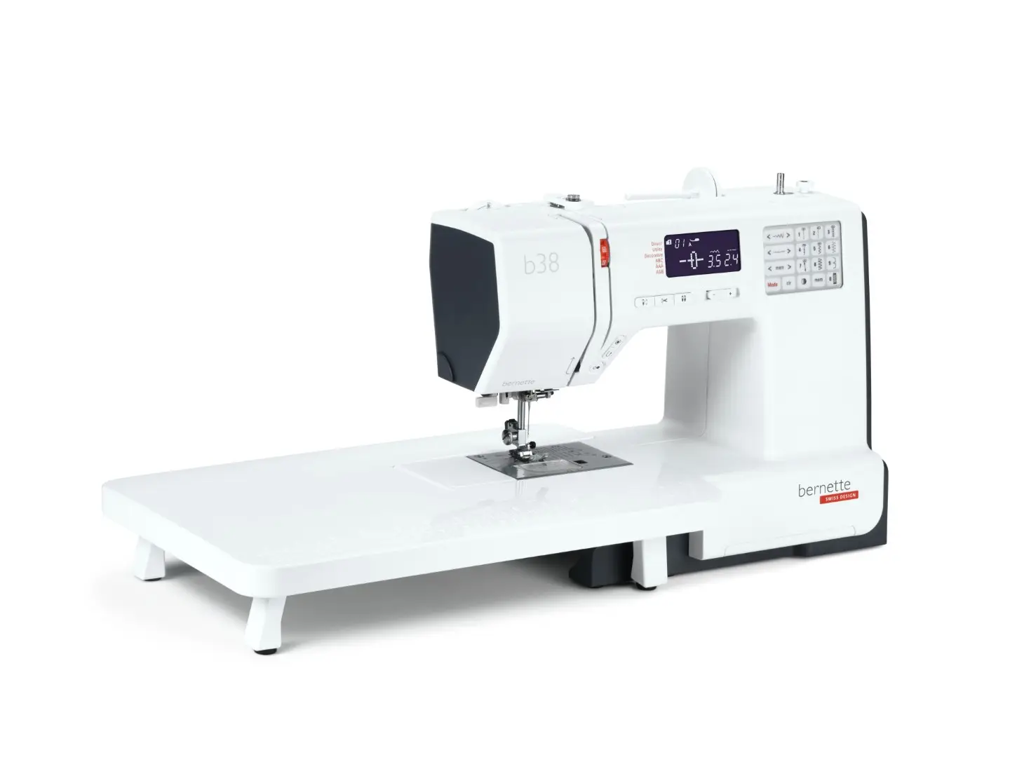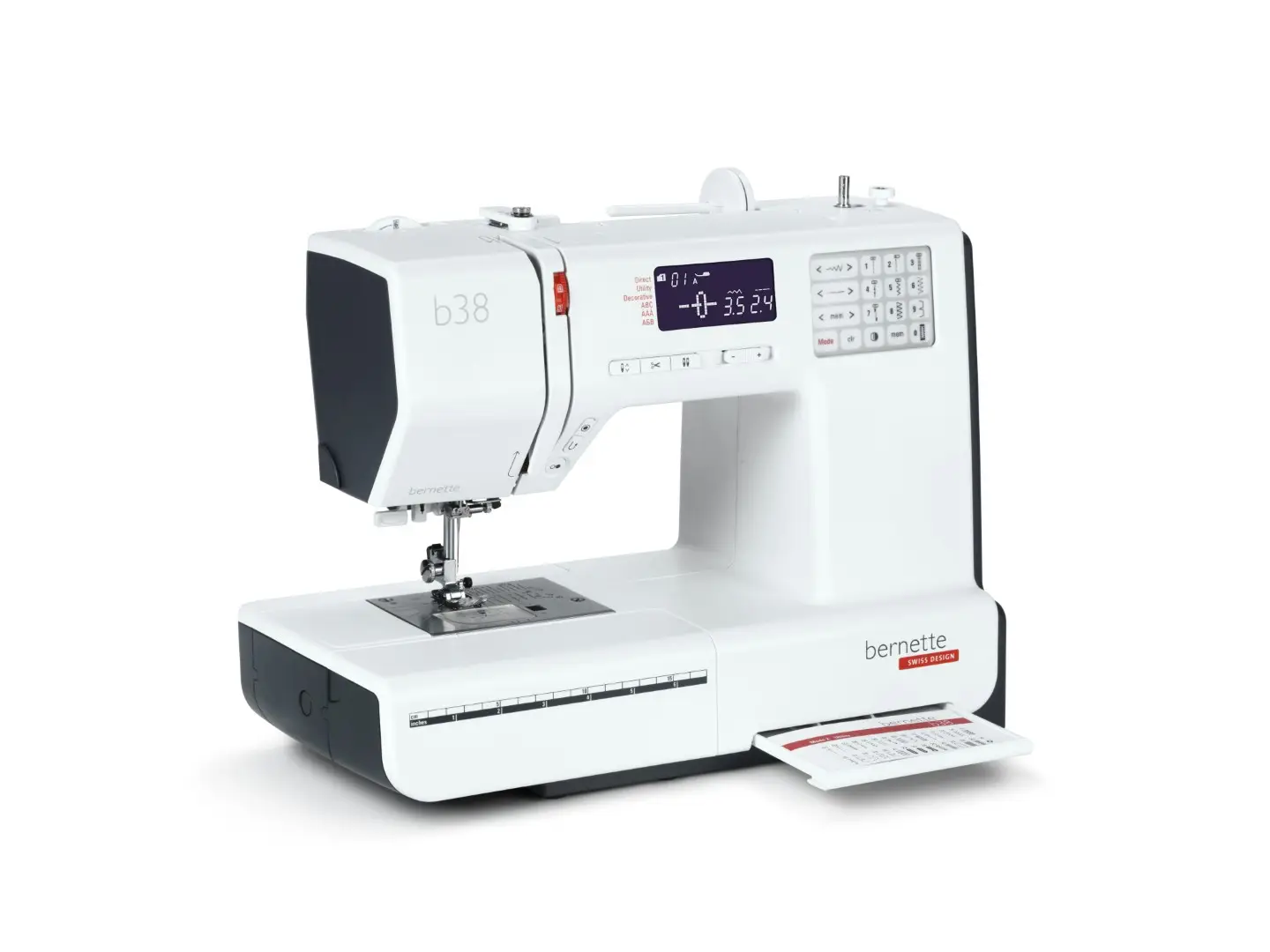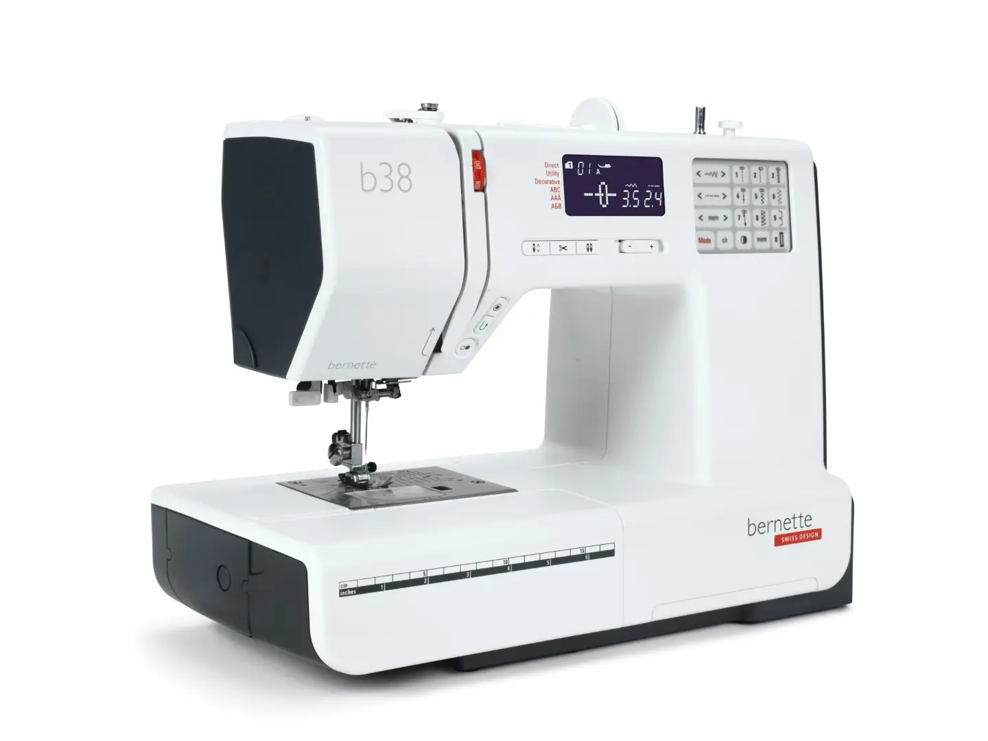 The bernette 38 is the top model in the bernette 30 series. This computerised sewing machine offers a wide range of functions at an affordable price–leaving nothing to be desired. It offers 394 different stitches, including the stretch stitch for elastic fabrics. This means you can create fantastic T-shirts from jersey fabric, for example. The bernette 38 also has eight different 1-step buttonholes and three alphabets. In addition, it has a memory function, via which you can store various combinations of patterns. The bernette 38 has a useful speed regulator, which can be adjusted on the display. As the top model, this impressive sewing machine also has a bright LED sewing light, a threader and both an automatic and a manual thread cutter. The bernette 38 comes with eight different presser feet (soles) and a large extension table as standard.